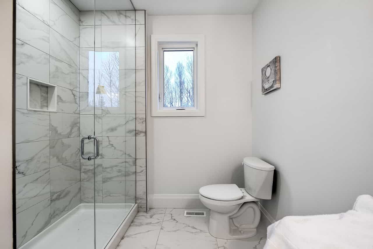Timeless marble and glass create a luxurious spa-like retreat, perfect for relaxation and function.